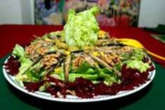 MOD DE PREPARARE: Se spala salata, se taie fasii si se pune in bol. Se adauga porumb, ton, zeama de lamaie, cateva picaturi de ulei de masline, sare si se amesteca. Se pun pe un platou ornat cu foi de salata.Se asaza deasupra sprotul afumat, maslinele verzi si miezul de nuca. Se orneaza cu sfecla rosie. Ca sa iasa mai spectaculoasa, putem alege o salata creata si putem adauga ca decor gogosari.