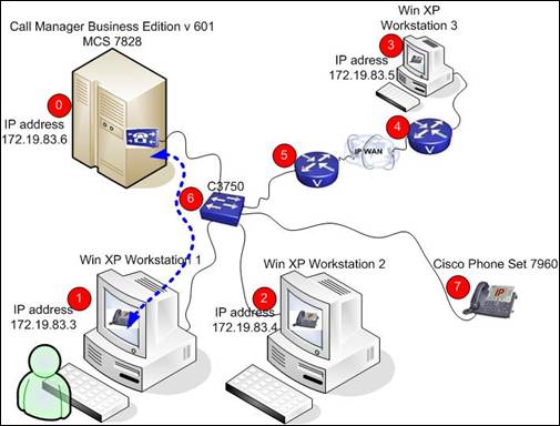 CUCM Business Edition is being installed from a server. This server is indicated in the network diagram with a red circle labeled '0'. For the purposes of this lab the mechanical process of putting the DVD in a physical drive is circumvented through the use of the VM Ware software. The screens and processes that will be followed in this lab will mirror the Communications Manager Business Edition DVD installation process.