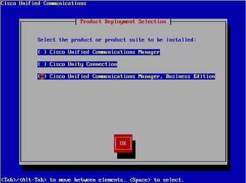 Step 4: The next screen will bring up the option for installing the Cisco Unified Communication Manager, Business Edition. Navigate and choose Business Edition (using the space bar to mark this version for the installation) click OK and press Enter to continue.