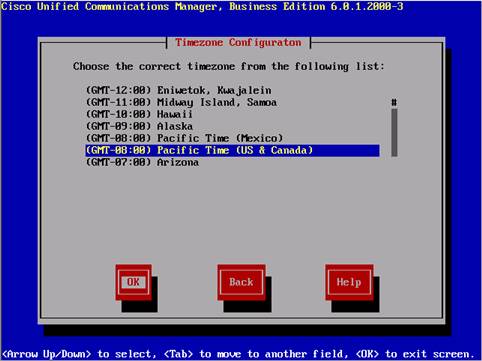 Step 8: Select the time zone using . Use the TAB button to move the cursor to OK and press Enter.