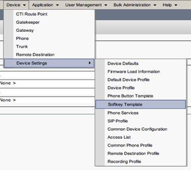 Step 25: Select Device Device Settings Softkey Template to configure the Mobility Softkeys.