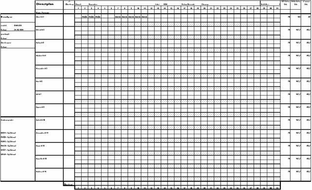 Nun können Sie ein neues Blatt in die Arbeitsmappe einfügen, in dem Sie Ihre Vorstellungen eines Dienstplanes verwirklichen können. Allerdings müssen Sie darauf achten, daß die Bereiche für Zeichenlegende und Daten zusammenhängend sind. Die Zeichenlegende ist 25 Einträge breit, der Datenbereich ist 36 Einträge breit und von variabler Länge (je nach Anzahl der Personen, die der Plan umfaßt). Sowohl die Zeichenlegende als auch der Datenbereich können horizontal oder vertikal angeordnet sein, können also auch "gedreht" (transponiert) dargestellt werden.