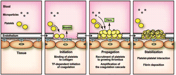 Factorul declansator al activarii hemostazei este pierderea functiei de bariera a endoteliului vascular (separa fluxul sanguin de spatiul subendotelial). Īn mod arbitrar raspunsul plachetar poate fi īmpartit īn trei etape: adeziune, activare si agregare. Rezultatul este formarea cheagului plachetar.