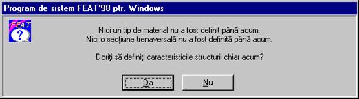 Daca obiectati ca nu au fost definite materialele si sectiunile transversale, aveti dreptate. Pe de alta parte, sistemul FEAT'98 are un sistem expert simplu. Acest "sistem expert" supervizeaza actiunile dumneavoastra si sugereaza corectiile. De aceea, daca activati meniul Structura / Inserare componente FEAT'98 va atentioneaza ca nu au fost înca definite materialele si sectiunile transversale si 13113w226n va da posibilitatea sa o faceti acum.