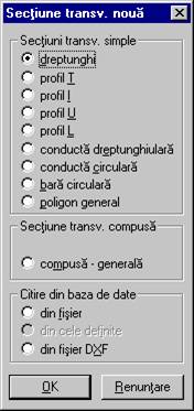 Când definiti materialul pentru proiect si închideti gestionarul de materiale, FEAT'98 va cere sa introduceti sectiunea transversala pe care o utilizati în proiect. Gestionarul de sectiuni transversale va porni. Prima caseta de dialog va ofera o posibilitatea de selectie a unui tip de sectiuni transversale: