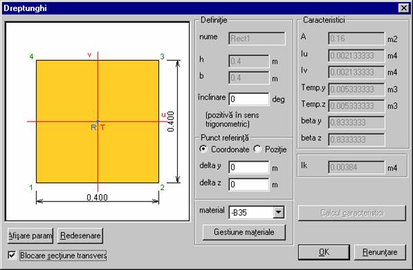 Introduceti dimensiunile sectiunii h = 0.4 m si b = 0.4 m. Apasati Calcul caracteristici. Gestionarul de sectiuni transversale va calcula caracteristicile sectiunii pentru dumneavoastra. Pentru a evita o schimbare accidentala a parametrilor introdusi si calculati, puteti bloca sectiunea. Utilizati optiunea Blocare sectiune transversala din partea stânga jos a acestei ferestre de dialog.