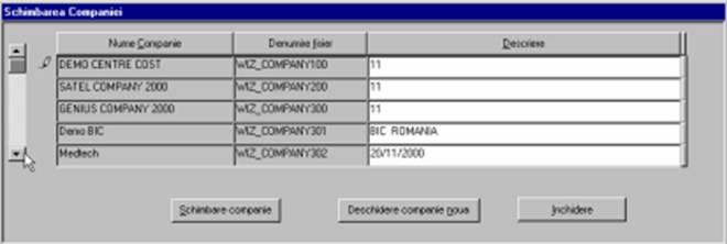 Dupa cum s-a aratat,WizCount2000 va permite lucrul cu mai multe companii. Pentru a alege compania cu care doriti sa lucrati, selectati optiunea "Schimbare Companie" din meniul Operatiuni Aditionale din ecranul principal, WizCount2000 va afisa urmatoarea fereastra: