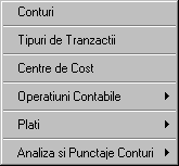 CONTABILITATE: Selectati aceasta optiune pentru a intra in programul de contabilitate. Acest program va contine: definirea de conturi, tipuri de tranzactii, centrii de cost,introducerea de note contabile, etc.