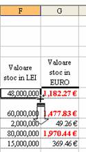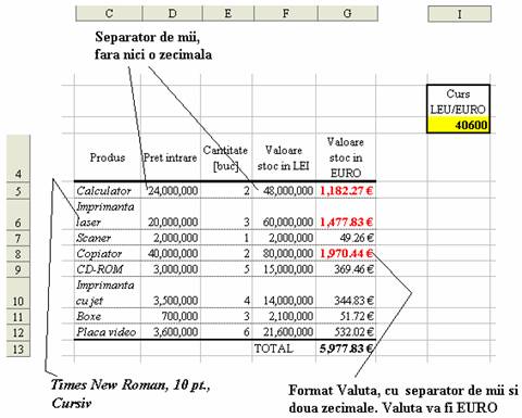 Toate celulele (din toate cele trei foi de calcul) ce contin valori exprimate īn LEI sau EURO sunt formatate cu separator de mii si cu doua zecimale. Valorile ce exprima cantitatea (exprimata īn bucati) sunt formatate cu zero zecimale;