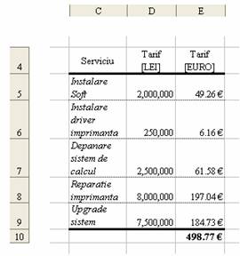 Foaia de calcul Servicii (vezi figura 2) contine īn zona C4:E10 un tabel care īnregistreaza o lista de servicii si tarifele percepute, exprimate īn LEI si respectiv EURO. Exista si aici un TOTAL, care sumeaza tarifele exprimate īn EURO.
