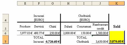 Pentru foaia de calcul Centralizare, Incasarile [EURO] si Cheltuielile [EURO] se scriu īn celulele E4, respectiv H4, dar se centreaza pe zonele E4:G4, respectiv H4:J4.