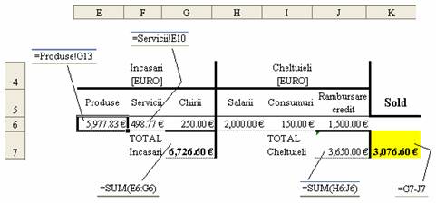 Foaia de calcul Centralizare (vezi figura 3) contine īn zona E4:K7 un tabel centralizator care aduna date din foile de calcul Produse si Servicii, īn scopul calcularii unui sold (celula K7). Soldul reprezinta diferenta dintre īncasari si diferitele tipuri de cheltuieli. Īn esenta soldul pozitiv īnseamna profit, iar un sold negativ ar īnsemna o pierdere.