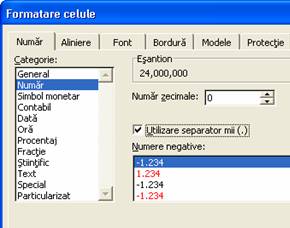 Pentru formatarea cu separatori de mii, sau pentru alegerea formatului Simbol monetar se va folosi cāmpul Format Celule Numar. Īn figurile 11 si 12 se poate vedea ce setari au fost alese pentru formatarea īn sistem Simbol monetar, respectiv cu separatori de mii.