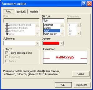 Dupa precizarea conditiei (Conditia 1, 2 sau 3), se apasa butonul Format, care conduce la o caseta de dialog de tipul celei din figura 14, cu ajutorul careia se pot aplica celulei/celulelor selectata/selectate anumite caracteristici de formatare: