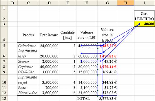 Documentul Excel initial contine foile de calcul: Produse, Servicii, Centralizare. Foaia de calcul Produse (vezi figura 1) contine īn zona C4:G13 un tabel care furnizeaza informatii despre produsele aprovizionate, pretul unitar de intrare si cantitatea aprovizionata. Pe baza acestor date se va determina valoarea stocului pentru fiecare produs, īn LEI si īn EURO. Fireste Valoare stoc in LEI=Pret intrare x Cantitate [buc]. Pentru aflarea valorii stocului īn EURO, valoarea stocului īn LEI se īmparte (pentru fiecare produs) la cursul LEU/EURO. Paritatea LEU/EURO este continuta īn celula I3. Tabelul mai dispune si de o celula TOTAL, care contine totalul valorii stocului īn EURO.