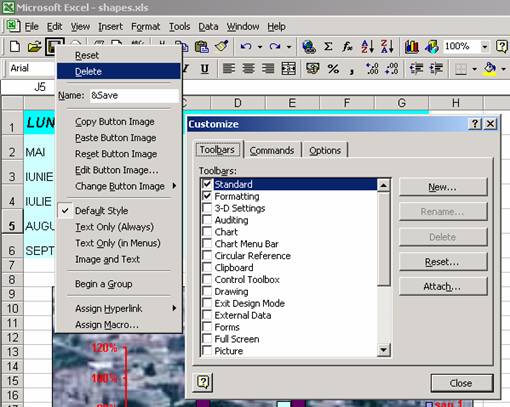 Pentru a sterge un buton existent pe o bara de instrumente deschide caseta de dialog Customize si apoi trage butonul in afara barei – fiind atent sa nu-l plasezi, insa, pe un alt meniu sau in alta bara de instrumente, caz in care Excel va muta butonul selectat in meniul sau bara respectiva. Cel mai sigur este sa eliberezi butonul mouse-ului cand langa indicator apare un X mare negru. O alta metoda este executarea unui click dreapta pe buton si selectarea comenzii Delete.