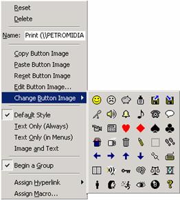 n Copy Button Image (Copiere imagine buton) – daca o imagine de pe un buton existent pe o bara de instrumente este apropiata de ceea ce doresti, copiaza imaginea, lipeste-o pe un alt buton si apoi editeaz-o. Secventa de copiere este urmatoarea: