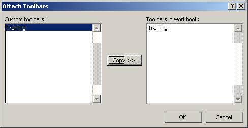 Pentru a atasa barele personalizate la diferiti registri de calcul incepe prin a deschide registrul de calcul respectiv. Deschide caseta Customize si executa click pe butonul Attach (Atasare) din fisa Toolbars. In caseta de dialog Attach Toolbars selecteaza bara in lista Custom Toolbars si executa click pe butonul Copy pentru a copia numele barei in lista Toolbars in Workbook
