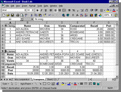 f) Bifati caseta de dialog Transpose, apoi click pe OK. ATENŢIE ! Nu puteti lipi tabelul transpus peste tabelul initial