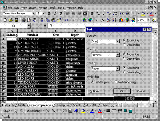 c) In caseta de dialog indicam cele doua sau trei coloane dupa care se va face ordonarea; ordonarea trebuie facuta începând cu cel mai înalt nivel