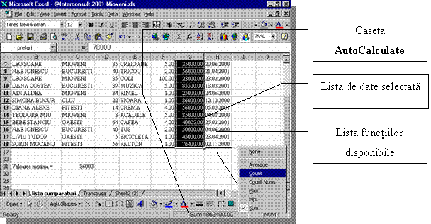 a) Selectam celulele pentru care dorim sa aflam suma, sau media, sau pe care vrem sa le numaram (functia folosita este afisata în caseta AutoCalculate aflata pe bara de stare).