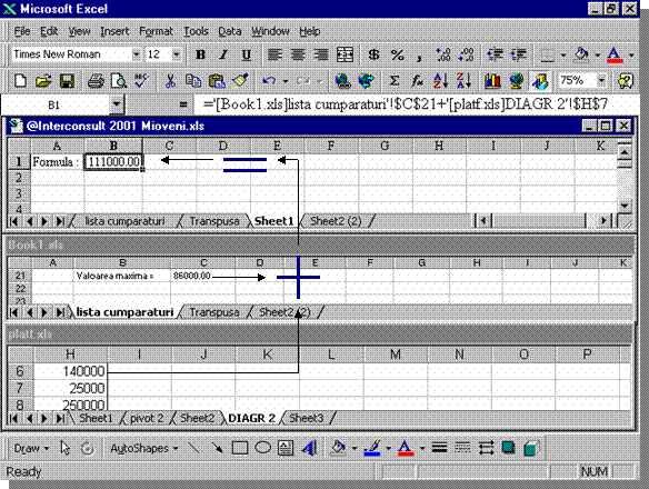 Când avem nevoie sa includem în formule adrese de celule din alte registre de calcul, cel mai usor este sa deschidem aceste registre în aceeasi fereastra.