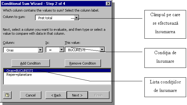 c) Stabilim coloana de adunat si criteriul; daca sunt mai multe criterii, executam click pe Add Condition si indicam si pe cel de-al doilea criteriu; executam click pe Next