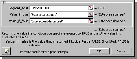Functia IF lucreaza astfel: daca (IF) o afirmatie este adevarata, atunci (THEN) celula ia prima valoare, daca nu (OTHERWISE) celula capata cea de-a doua valoare.