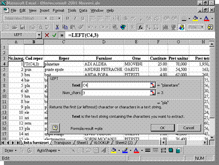 Aceste functii returneaza primele x caractere din extremitatea stânga (sau dreapta) a unei celule sau domeniu de celule. Sunt utile în cazul în care dorim sa cream un câmp numit Cod Reper, spre exemplu, care sa preia primele x caractere din denumirea unui reper. Modul de completare este ilustrat în figura urmatoare.