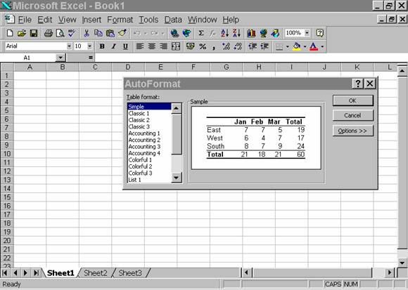 din FORMAT AUTOFORMAT = se afiseaza caseta de dialog de aici; din lista Table Format, selectam elementul dorit ;in caseta SAMPLE, va fi afisat aspectul formatului ales.
