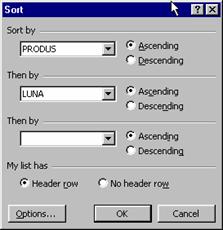 optiunea SORT din meniul DATA. Pe ecran va apărea fereastra de dialog SORT: