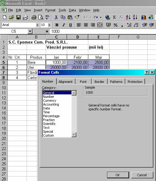 Nota: Când introduceti numere în Excel, formatul prestabilit este General. Celulele nu vor avea aplicat nici un format numeric specific.