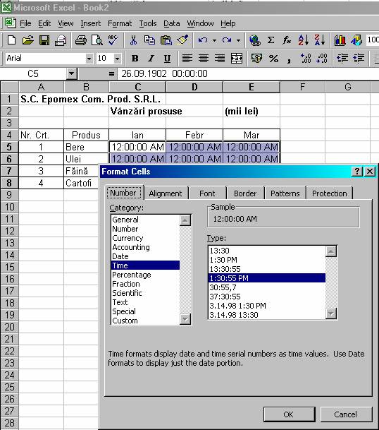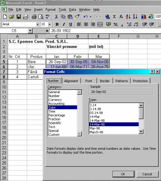 Efectuati clic pe Category Date din rubrica Number a casetei de dialog Format Cells