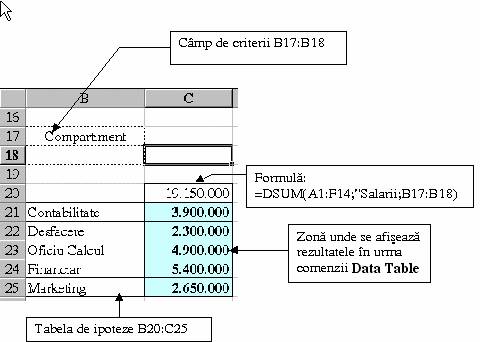 Astfel, daca s-ar fi dorit calcularea sumei si mediei salariilor economistilor, tabela de ipoteze ar contine trei coloane, una pentru marcarea valorilor studiate, adica parametrii, a doua pentru rezultatele calculului sumei salariilor si a treia pentru calculul mediei salariilor. Câmpul de criterii (B17:C18) a fost completat cu rubrica "Functia" pentru a sintetiza informatia referitoare la economisti. Tabelul ce contine sursa de date pentru sintetizare a fost declarat la adresa A3:E15. Schema de organizare a informatiilor în tabela de ipoteze este prezentata în figura 1.127.