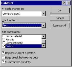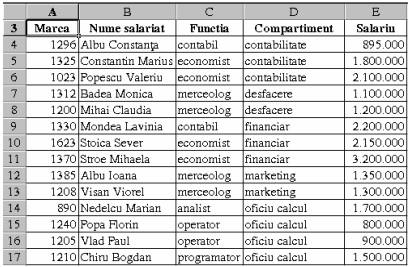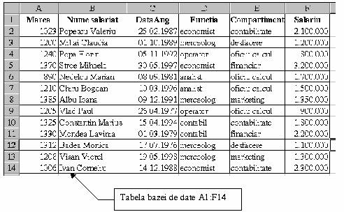 Plecând de la o baza de date pentru evidenta personalului unei societati comerciale, se calculeaza suma salariilor pe compartimente functionale. Tabelul ce contine baza de date va fi definit pe coordonatele A1:F14, figura 1.122.