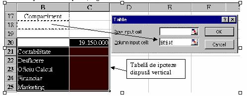 se activeaza comanda Data Table si în caseta Table se completeaza adresa celulei care contine criteriul în rubrica Column Input Cell- tabela de ipoteze fiind orientata în acest caz pe coloana ( în cazul organizarii tabelei pe linie.)