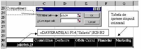 Un alt exemplu derivat din primul, vizeaza calculul mediei salariilor pe compartimente. De aceasta data, datele vor fi organizate orizontal- pe linie- si în consecinta se va completa adresa celulei care contine criteriul în rubrica Row Input Cell aferenta casetei de dialog Table. Figura 1.125 ilustreaza acest exemplu.