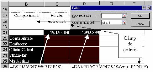 Comanda Data Table permite completarea automata a tabloului ca si cum formula sau formulele situate pe prima linie ar fi aplicate succesiv pentru fiecare valoare gasita în prima coloana sau în prima linie, aceste valori reprezentand parametrii sintetizarii informatiei.