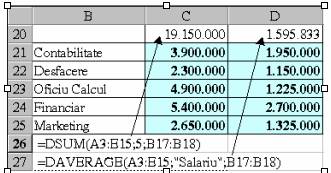 Extragerea din baza de date se va face prin intermediul functiei DSUM care are ca argumente: baza de date, rubrica pe care se opereaza calculul si câmpul de criterii (în care sunt precizate cele 2 restrictii; Acest exemplu îmbina facilitatile de interogare a bazelor de date prin criterii calculate cu facilitati de sintetizare a informatiei prin regrupare potrivit criteriilor enuntate.