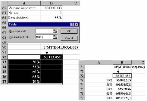 credit de 80 de milioane lei, contractat pe 3 ani, pentru mai multe variante de rata a dobânzii (aplicatie exemplificata în figura urmatoare), sau sa se calculeze aceleasi sume rambursabile lunar, aferente aceluiasi credit, cu o dobânda fixa de 60%, pentru mai multe variante de perioade de rambursare: