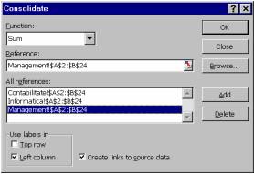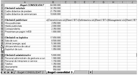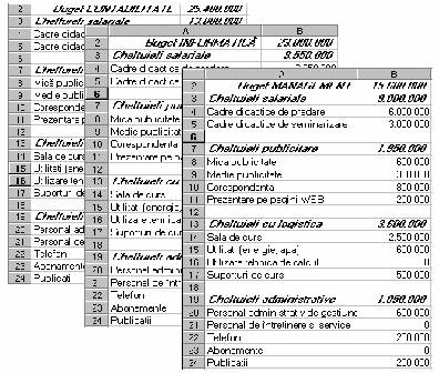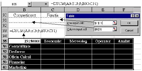 se introduce formula de însumare =SUM(A3:E15;5;B30:C31) în coltul superior stâng al tabelei de ipoteze (la adresa B35). Formula va genera rezultate centralizate pentru fiecare functie si compartiment în parte;
