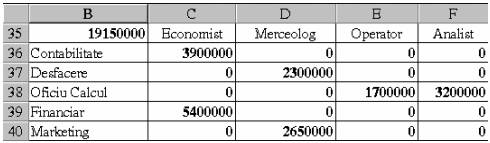 se construieste tabela de ipoteze, completând pe prima linie functiile salariatilor pentru care se face sintetizarea prin însumare si pe prima coloana compartimentele functionale pentru care sa se faca respectiva regrupare;