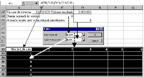Se va genera un tablou de amortizare accelerata pe ani de functionare si pe durata pentru care se calculeaza amortizarea. Modul de construire al tabelei cu doua variabile este prezentat în figura 1.132.