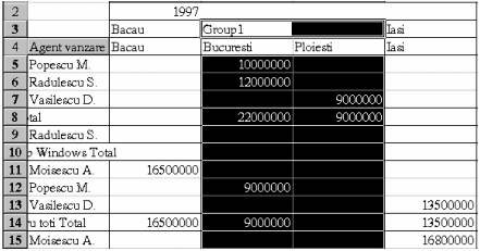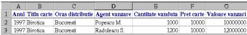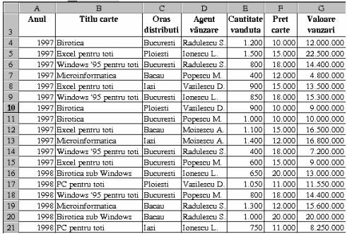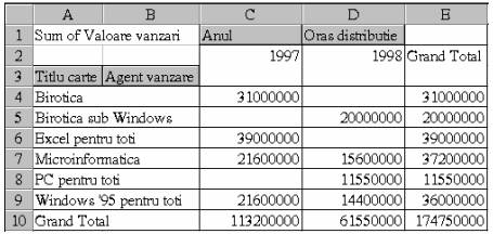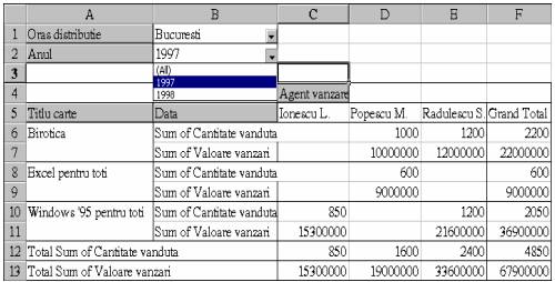 Un exemplu edificator de construire si utilizare a tabelei pivot ar consta în sintetizarea informatiei pentru o editura, referitoare la vânzarile de carte;Fie o tabela (figura 1.134) aferenta unei baze de date care regrupeaza informatii referitoare la vânzarile de carte de informatica pe orase (Bucuresti, Ploiesti, Bacau, Iasi), pe doi ani (1997/1998), pe agenti de vânzare (Radulescu S, Ionescu L, Popescu M, Vasilescu D, Moisescu A.), pe cantitati vândute (fiecare carte poate fi vânduta în mai multe orase si acelasi agent de vânzare poate opera vânzari pentru un titlu de carte sau mai multe, în acelasi oras sau în mai multe) si pe valori reiesite din vânzari. Pretul cartii se poate extrage (cu functia VLOOKUP) dintr-un tablou de consultare verticala. Volumul vânzarilor realizate de catre fiecare agent de vânzare este rezultatul înmultirii cantitatii vândute cu pretul cartilor. În rezolvarea aplicatiei, asistentul tabelei pivot (prin comanda Data - Pivot Table Report) parcurge urmatoarele patru etape (prin apasarea butonului Next> pentru fiecare etapa în parte):