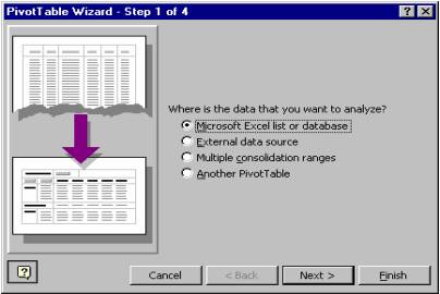 În prima etapa Pivot Table Wizard -Step 1 of 4 (figura 1.135) se alege sursa de date pentru sintetizarea informatiei: