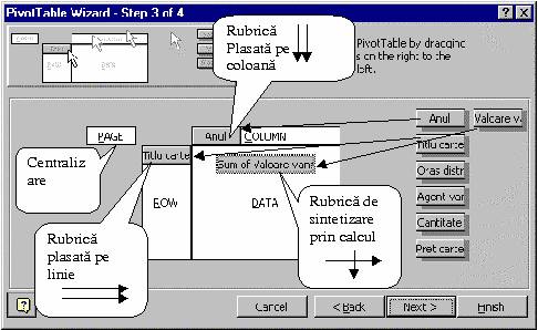 Într-o a treia etapa Pivot Table Wizard- Step 3 of 4 (fig. 1.137) are loc selectarea datelor, prin care se precizeaza care rubrica(rubricii) va(vor) fi plasata(e) pe linie, si care pe coloana. Plasarea rubricilor pe linie sau pe coloana se face prin glisarea rubricii respective într-o caseta de sintetizare, existând posibilitatea agregarii datelor prin plasarea mai multor rubrici (nivel descrescator de centralizare) pe linie sau pe coloana. În plus exista si posibilitatea declararii mai multor restrictii prin glisarea unuia sau mai multor elemente centralizatoare pe pagina (Page).