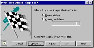 În a patra etapa PivotTable Wizard - Step 4 of 4, (fig. 1.138) se stabileste adresa tabelei pivot, si anume daca aceasta se va plasa într-o noua foaie de calcul (New worksheet), sau în foaia de calcul existenta, la o anumita adresa (Existing worksheet).