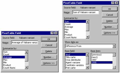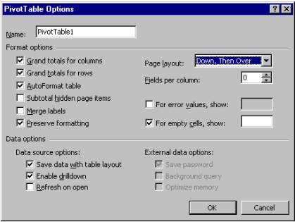 Tot în aceasta etapa se pot stabili si anumite optiuni ale tabelei pivot, prin apasarea butonului Options, prin caseta de dialog PivotTable Options (fig. 1.139):