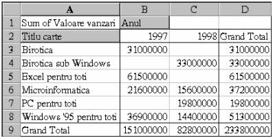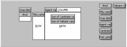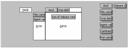 În cazul de fata, pentru rezolvarea sintetizarii "Volumul vânzarilor de carte de informatica pe titluri si pe ani", se va glisa rubrica "Denumire carte" pe linie (ROW) si rubrica "Anul" pe coloana (COLUMN), iar rubrica "Valoarea vânzarilor" va fi glisata în centrul machetei (DATA) pentru totalizare.