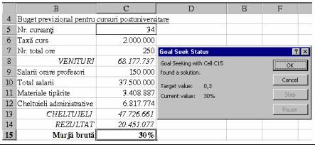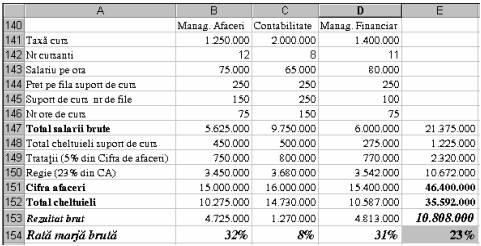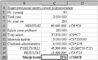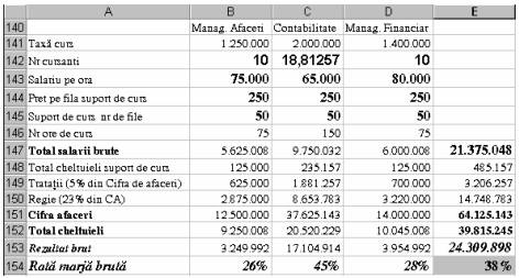 Modificând anumiti parametrii (Numarul de cursanti, Salariu pe ora, Pretul pe fila de suport de curs si numarul de file al suportului de curs), prin intermediul formulelor (prezentate în figura 1.171) se pot genera rezultate diferite atât pentru rentabilitatea fiecarui curs, cât si pentru rentabilitatea globala a institutului.